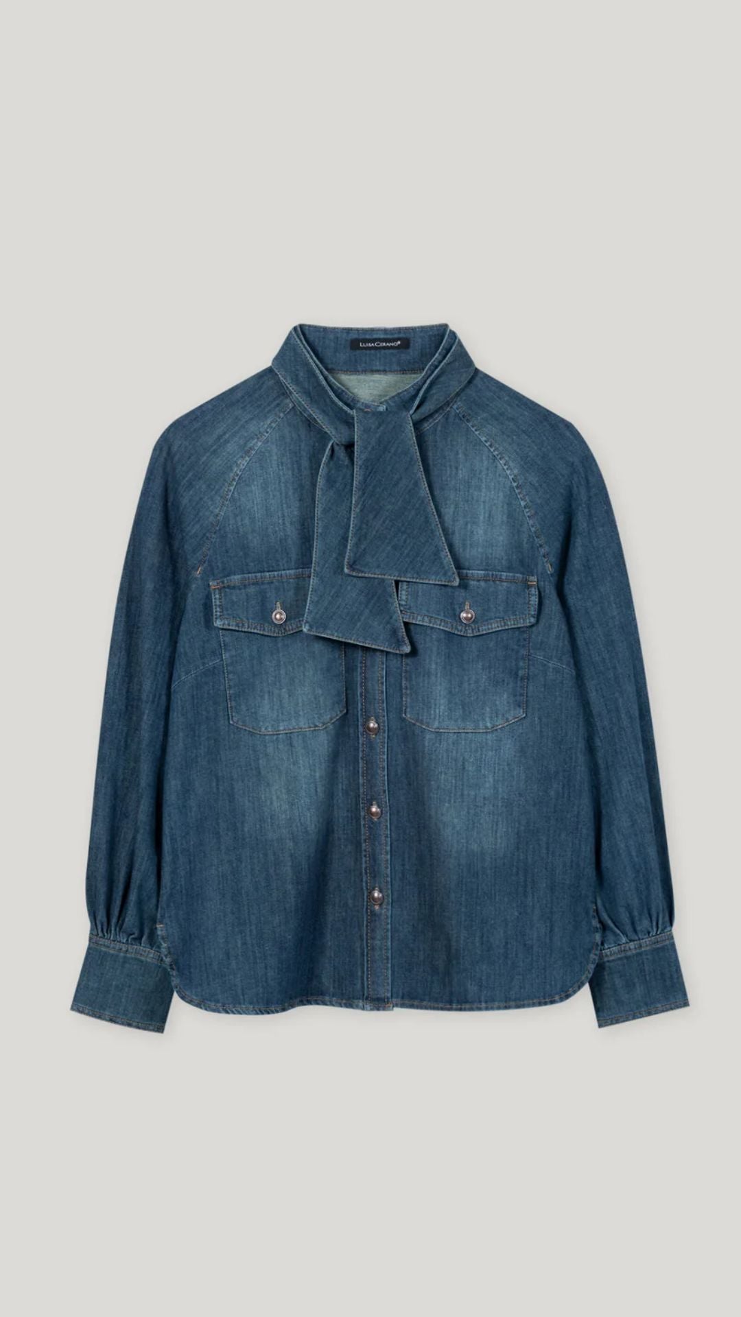 Denim blouse made from lightweight denim with a bleach wash. The blouse stands out with details such as a detachable flap, two breast pockets and vintage-look metal buttons.
