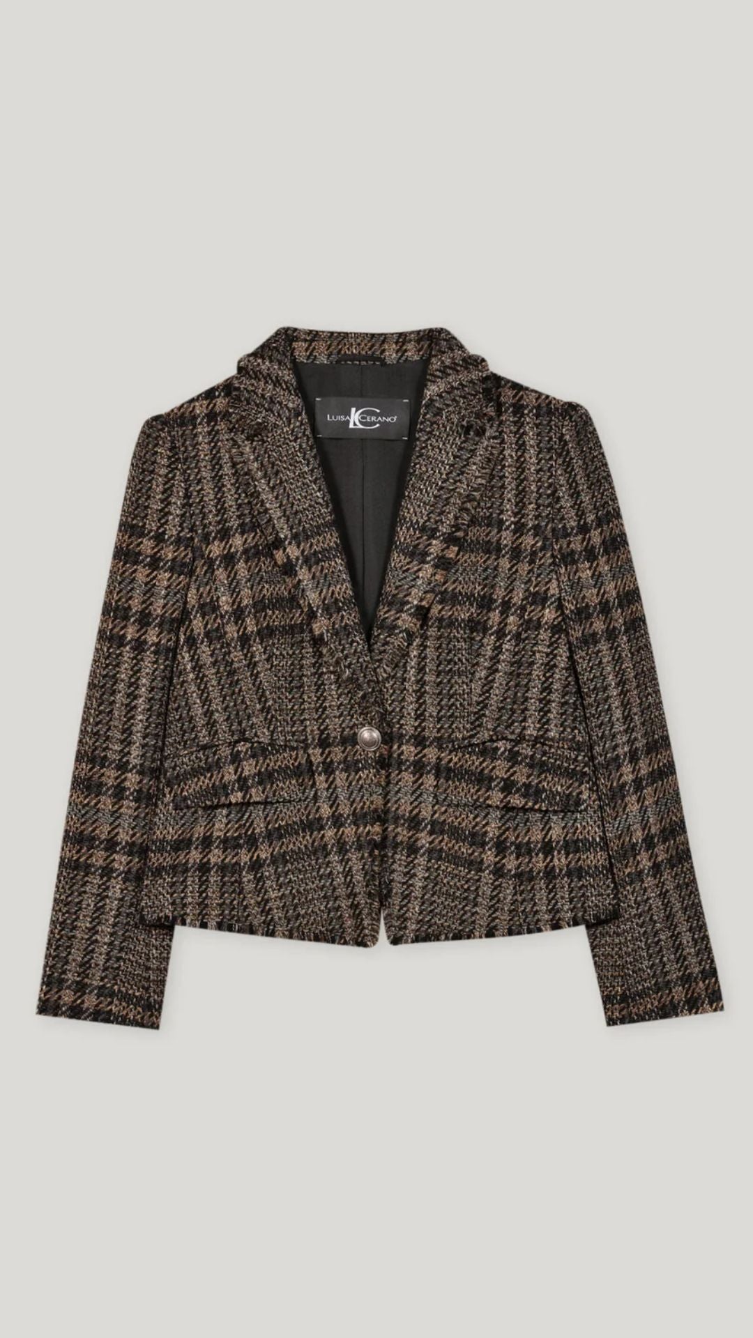 Short, tailored one-button blazer in a soft wool blend with a checked design and shoulder padding. The lined blazer has an open-edged finish and two patch flap pockets.