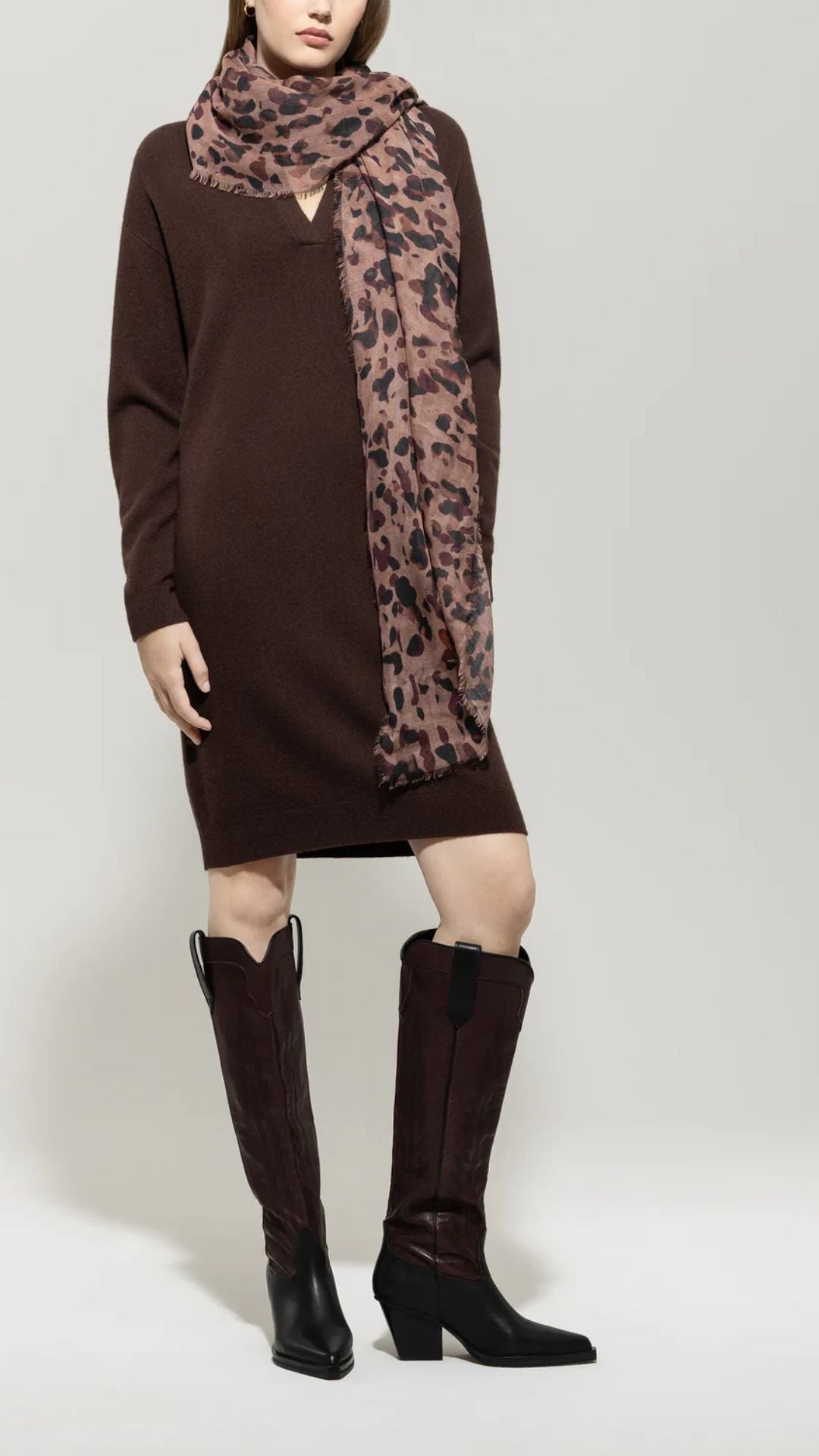 Rectangular scarf made from an elegant wool and silk blend with an abstract all-over print. The edges are finished with fine fringes.