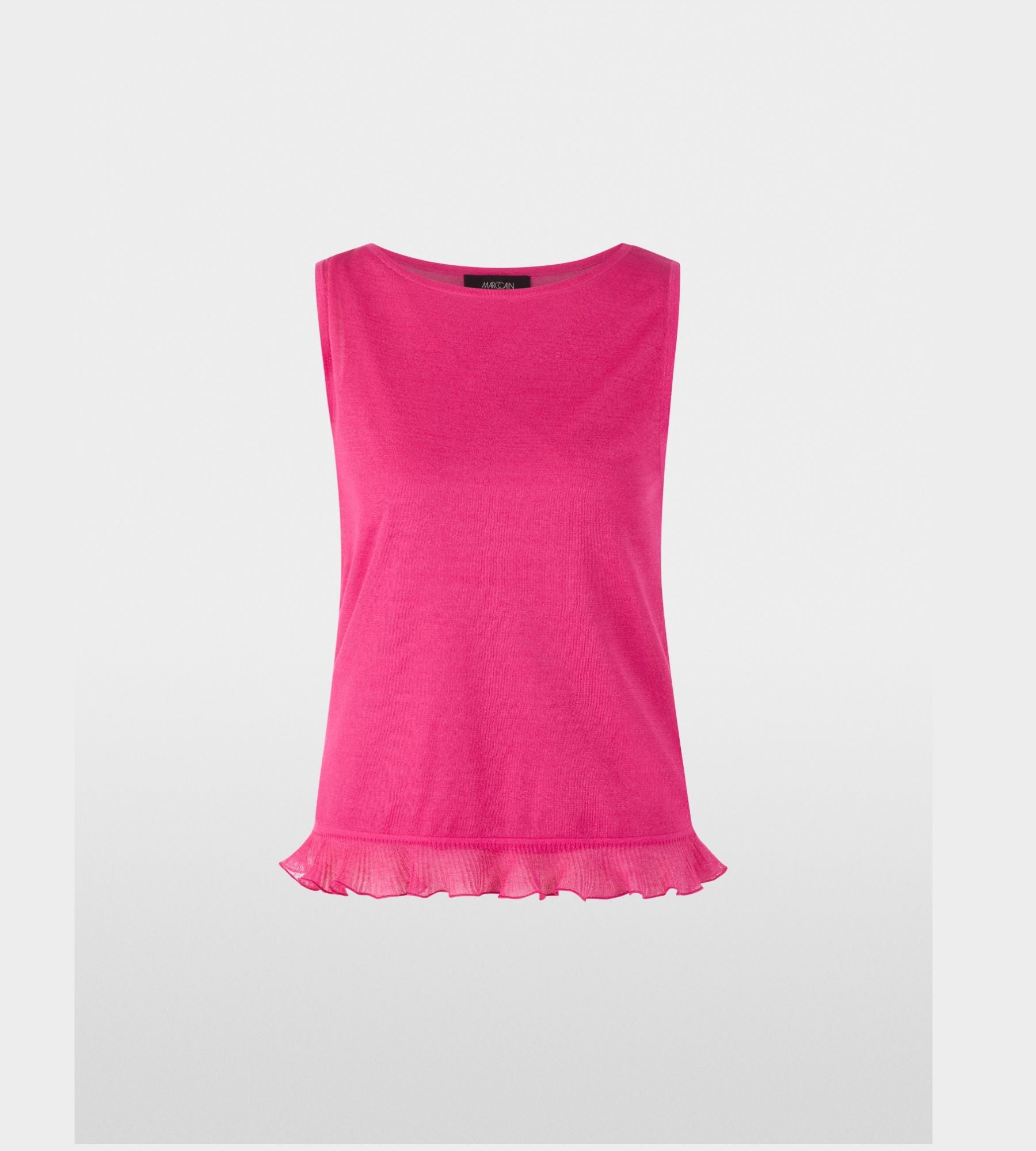 Sleeveless knit top made of a soft viscose blend with silk content and Lurex yarn, lightly cinched for a feminine silhouette. The round neckline and a flounce at the hem add elegant accents. The detachable underlayer made of modal-elastane ensures flexibility and comfort.