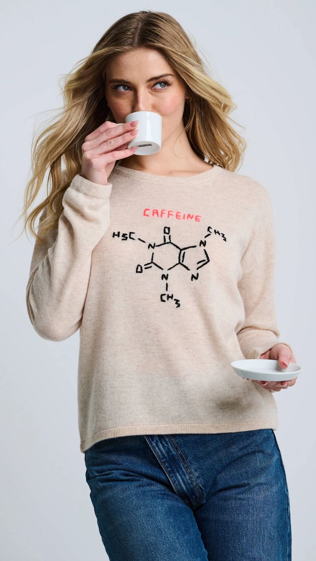 With hand-stitched “Caffeine” embroidery, the Perk Up sweater adds personality to your core knitwear. Made from a cozy Wool-Cashmere blend, this crewneck features drop shoulders and a true fit for comfort and structure. A subtly cheeky layer with luxe softness.