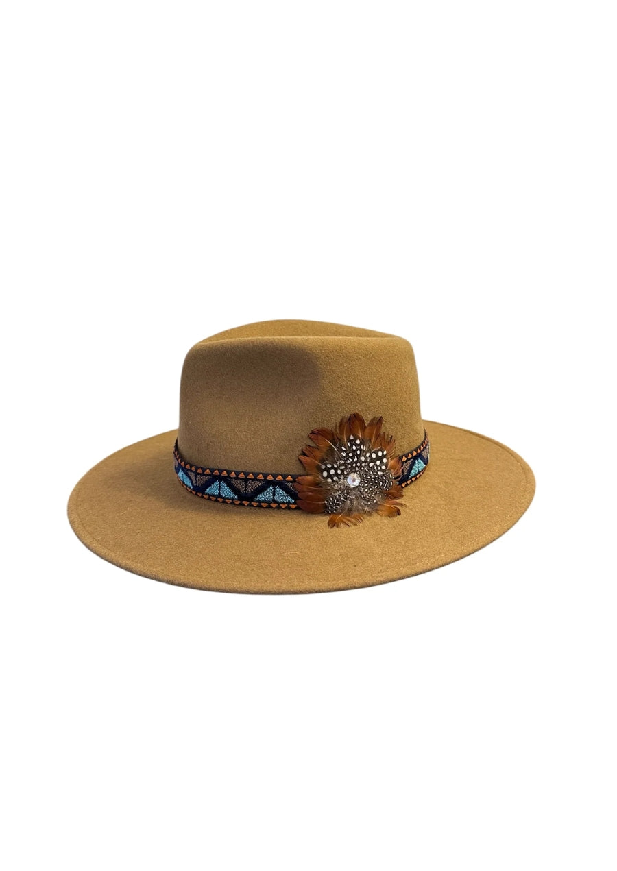 A touch of glamour defines this hat. A Camel felt paired with a vintage Japanese velvet band and a colorful feather, make this topper sophisticated and playful. Wear it in the field, at the farmer's market, or on Friday with at lunch with friends!