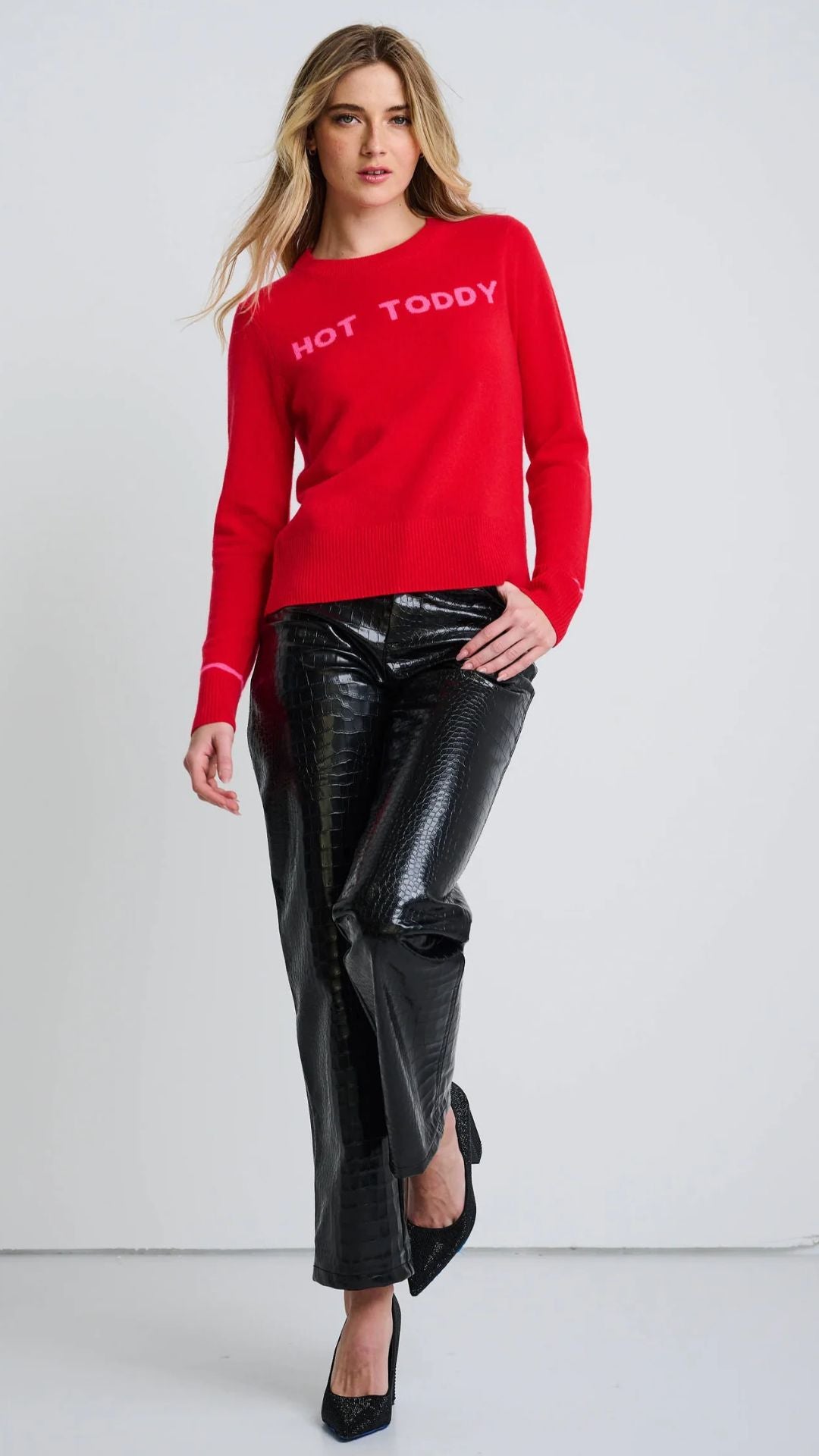 The Hot Toddy sweater brings playful charm to premium Cashmere. A classic crew neck features intarsia lettering at front and contrast stripe accents above the cuff. Polished with ribbed trim, this piece blends comfort with cozy and hot with toddy!