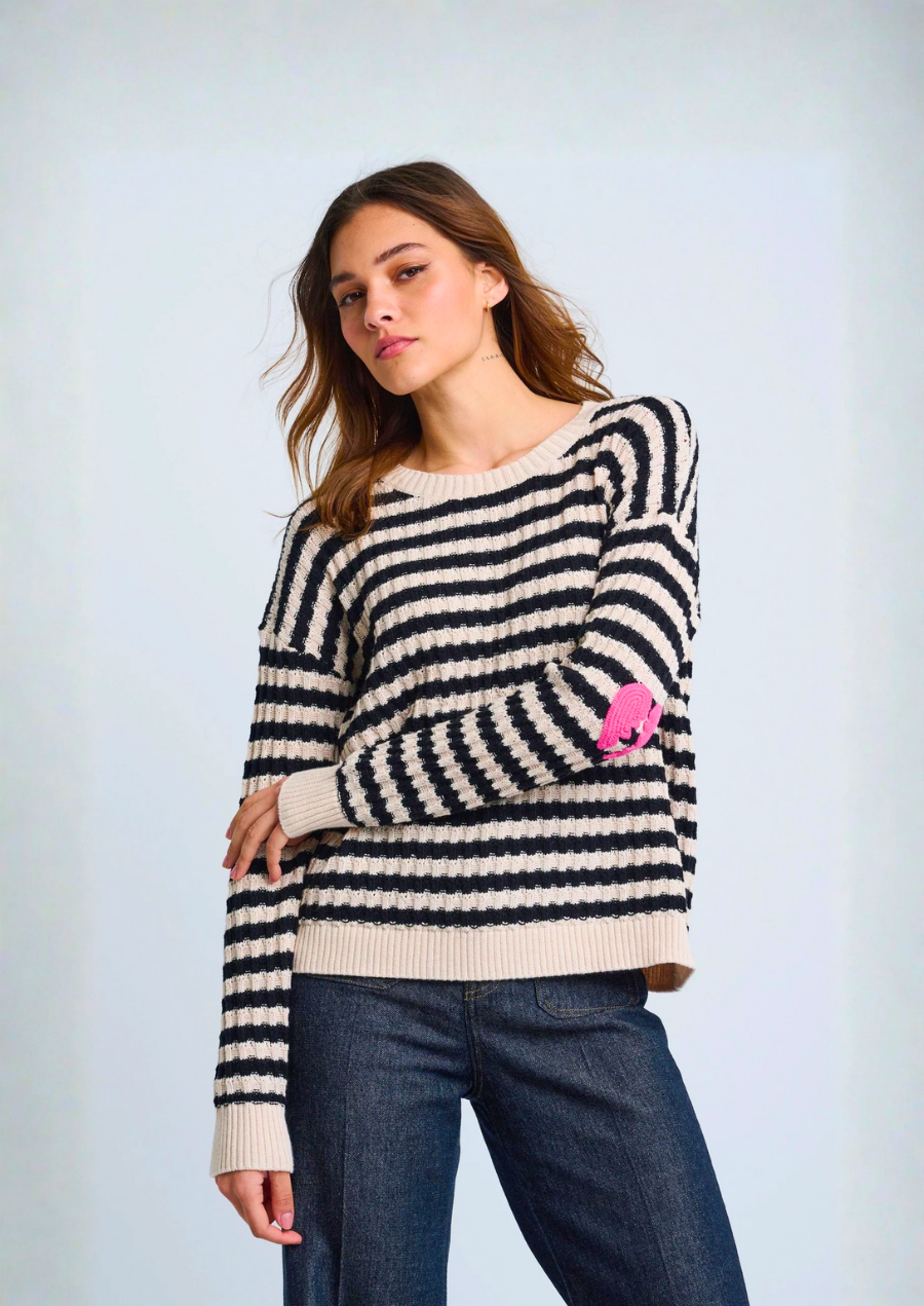 A modern classic with a playful edge, It’s Complicated features heart-embroidered elbow patches and striped rib trim. The relaxed crew neck fit and drop shoulder sleeves offer everyday ease, while the Cotton-Cashmere blend delivers lightweight warmth and softness.