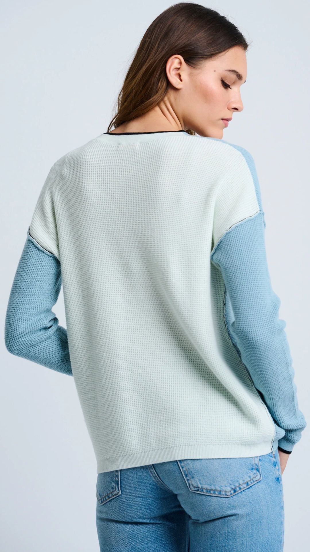 An everyday staple with a modern twist, the Around Town sweater is crafted from a soft Cotton-Cashmere blend and features a waffle stitch texture with contrast seam and cuff detailing. Its colorblock back and drop shoulders create visual interest and relaxed appeal. Finished with ribbed edges for a clean fit.