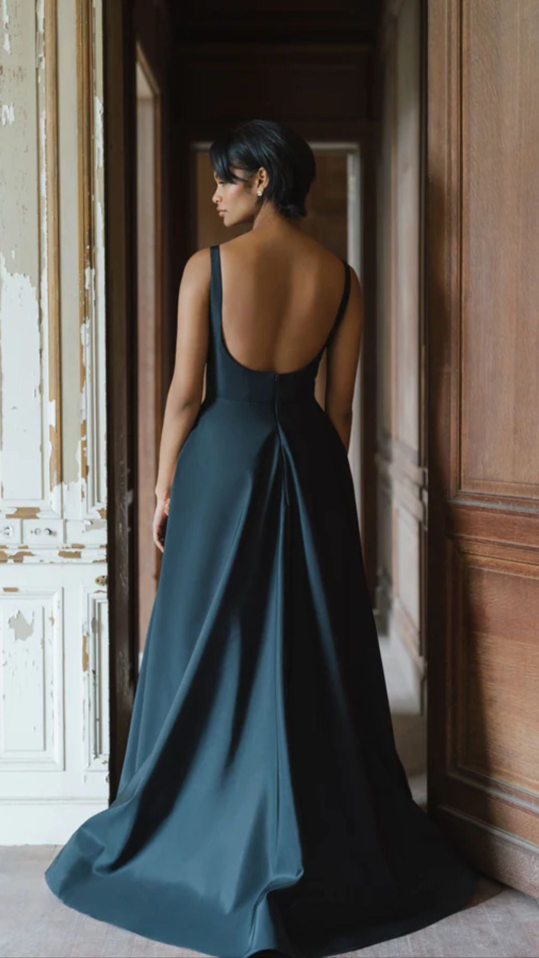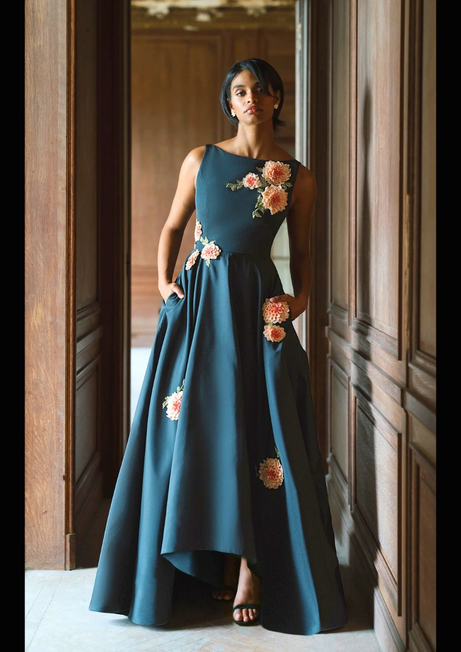 The Melrose is a high-low circle skirt gown of taffeta with bateau neckline, featuring scattered 3-dimensional embroidered dahlias.