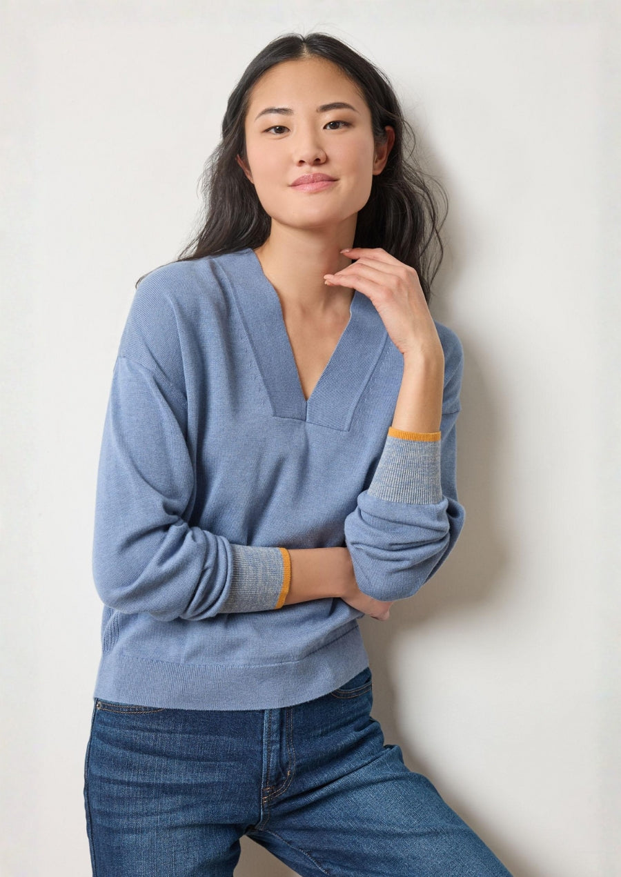 The V-Neck Pullover Sweater in our Cotton Modal blend yarn is a refined take on an effortless staple. Marled cuffs and contrast tipping at the sleeve openings add subtle detail, while the wide trim squared-off V-neckline brings a modern touch. Designed with dropped shoulders and a loose bottom opening, this style is relaxed yet polished, perfect for everyday wear.