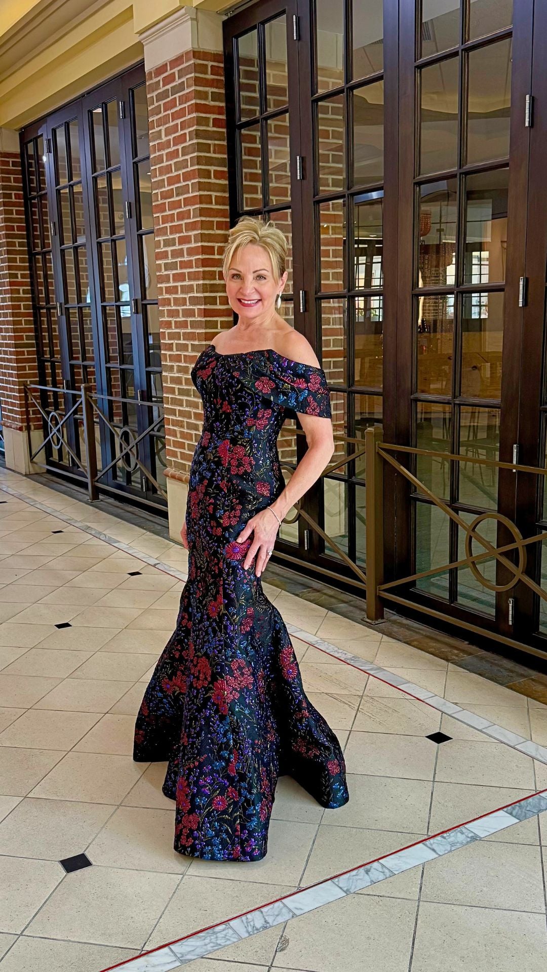 The Reyes is a trumpet gown with attached off the shoulder draped shawl in Lamé Embossed Jacquard.