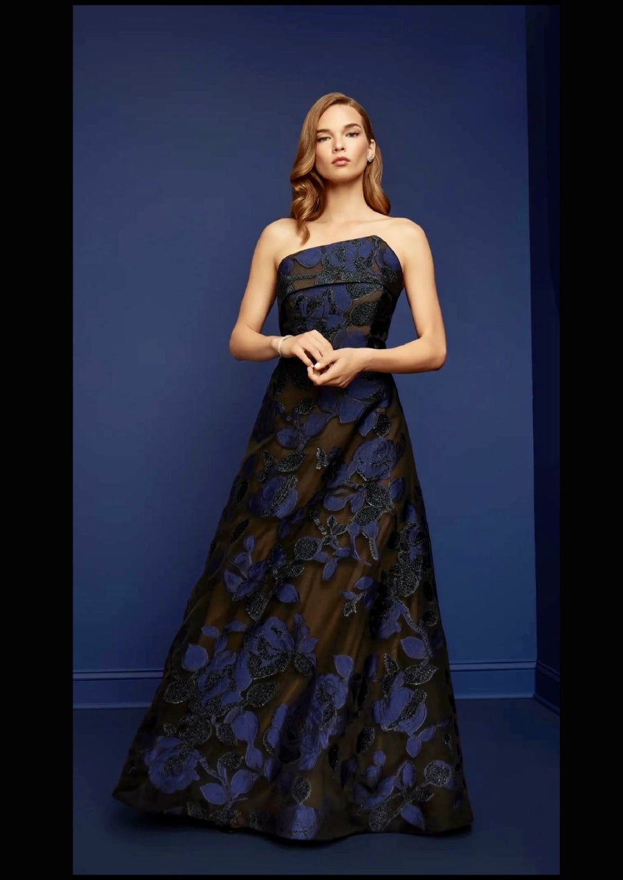 The Riggs Black Label evening gown by Anne Barge is an A-line gown with asymmetric cuff neckline of Metallic Jacquard Floral Organza. Shown in Navy/Black.