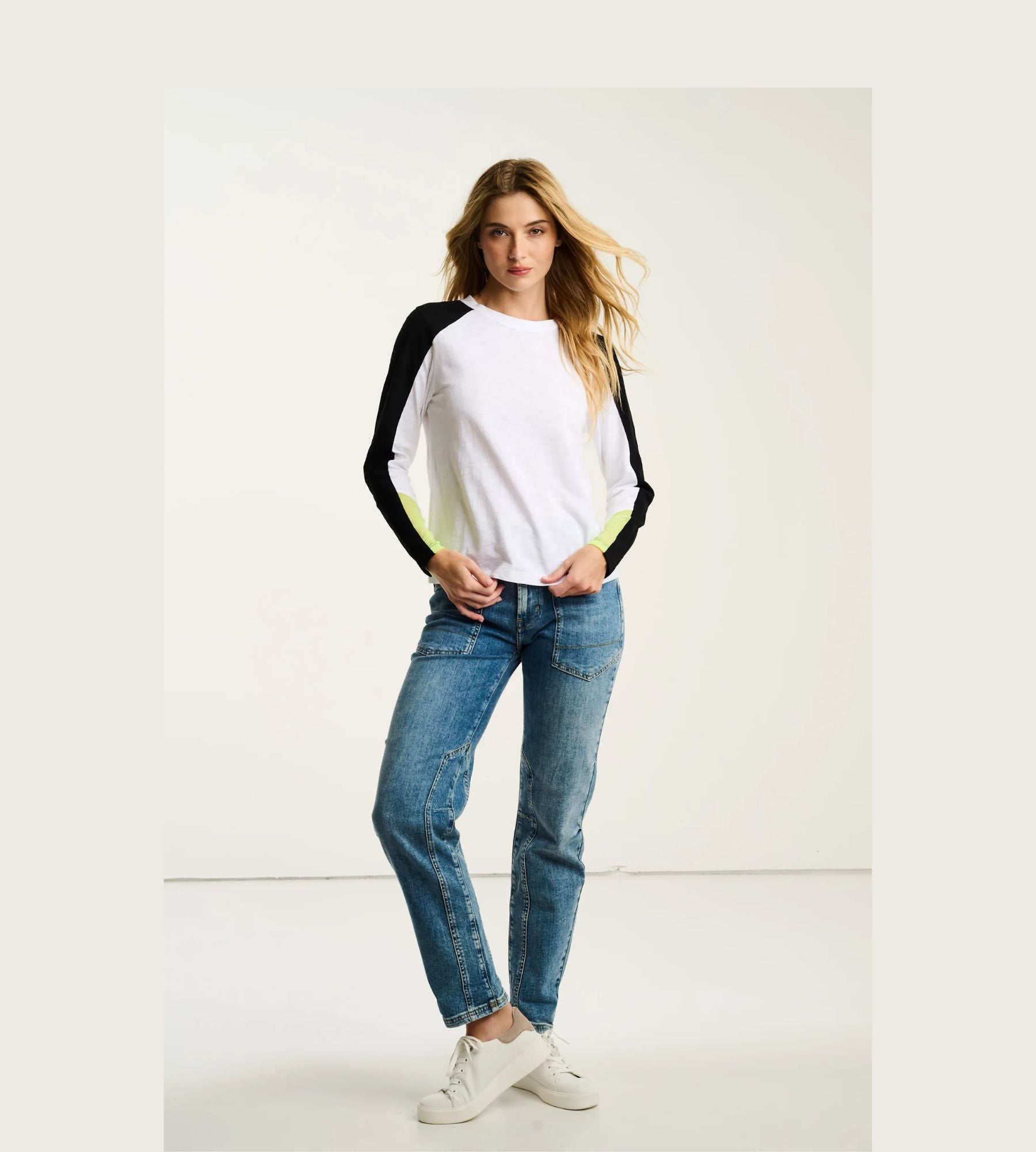 Sporty with a modern twist. Playing Games contrasts bold color-block sleeves with our iconic sheer mesh inset for a look that’s clean, cool, and just unexpected enough. A long-sleeve tee that guarantees you’re not blending in.
