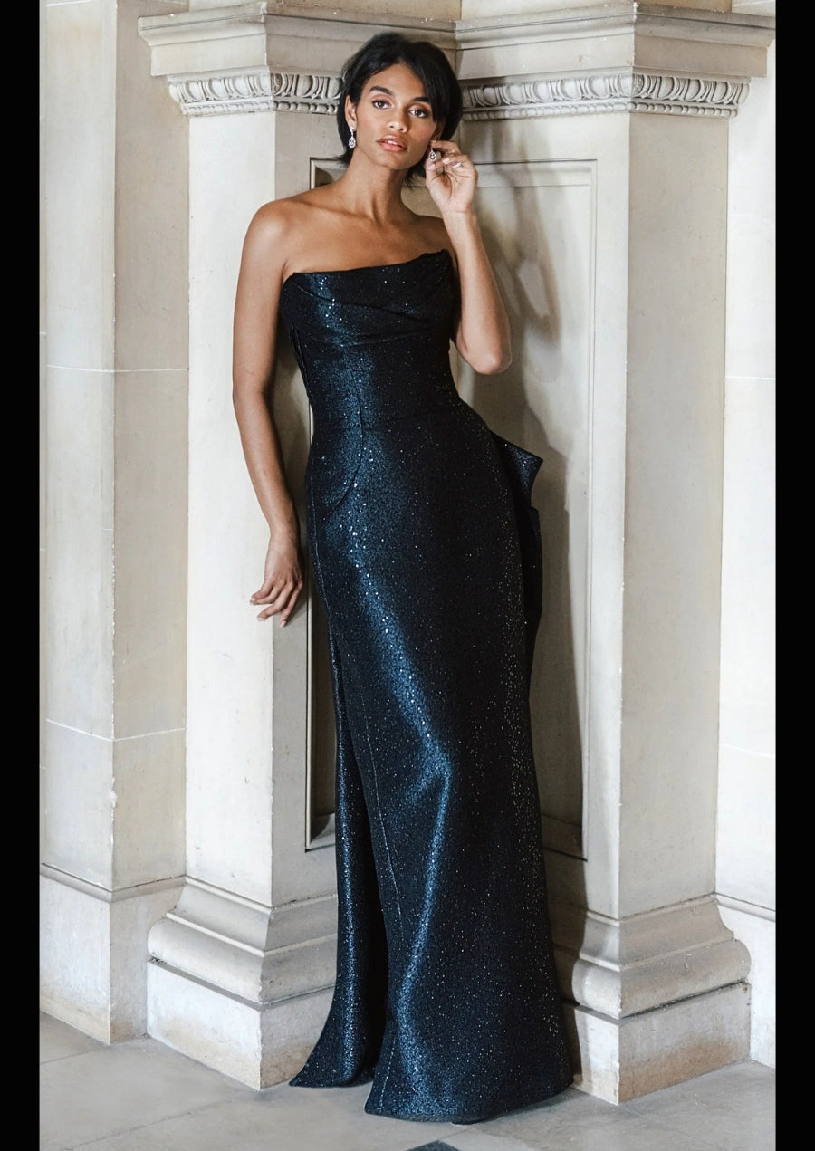 The Wagner is a peaked strapless column gown of Sequined Tweed with soft pleating along the neckline and dramatic draped train.