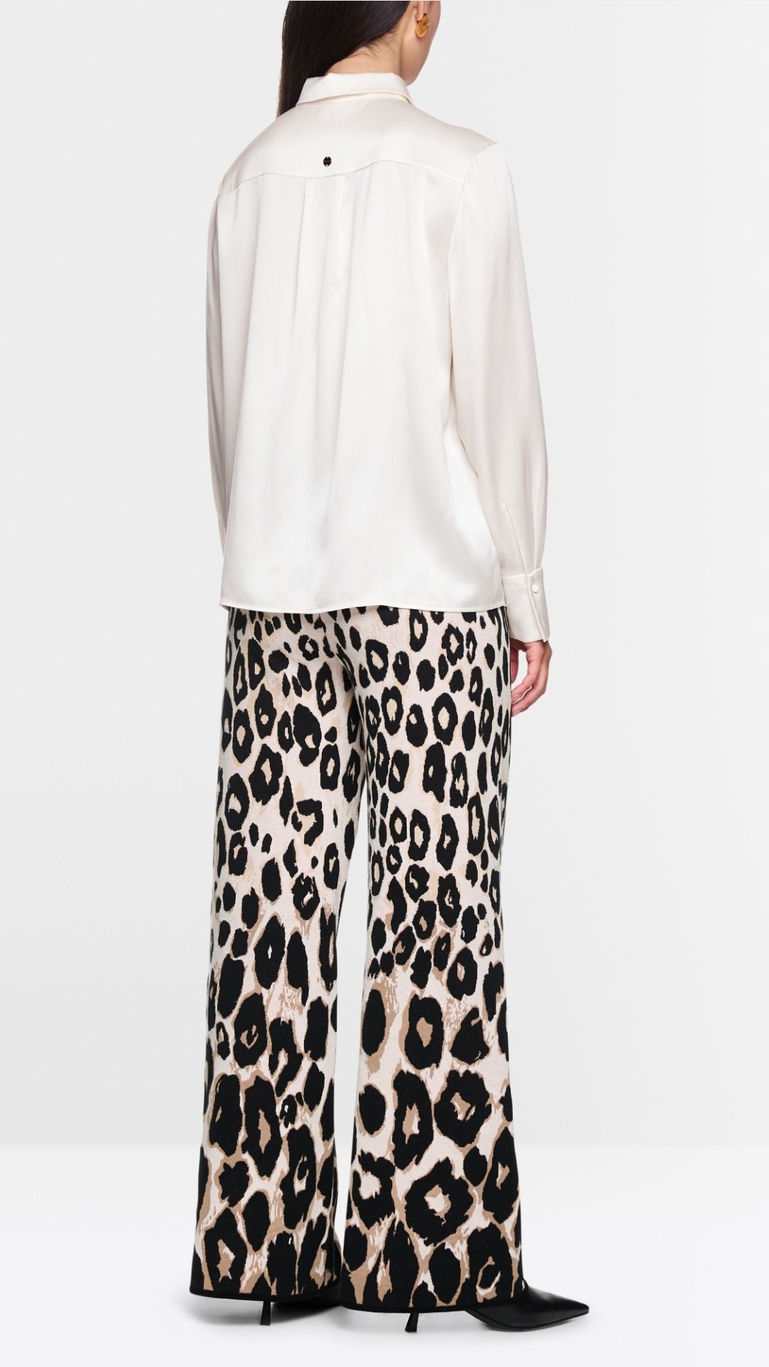 This classic blouse in shiny silk has a straight cut and a traditional collar. A special highlight is its elegant buttoning with sophisticated patent buttons, which remains open at the top to reveal a sparkling row of rhinestones. The sleeves end in stylish cuffs, embellished with a single patent button.